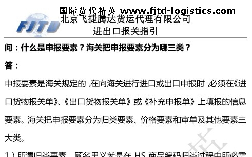 申報(bào)要素是海關(guān)規(guī)定的,在向海關(guān)進(jìn)行進(jìn)口或出口申報(bào)時(shí),必須在《進(jìn)口貨物報(bào)關(guān)單》、《出口貨物報(bào)關(guān)單》或《補(bǔ)充申報(bào)單》上填報(bào)的信息要素。海關(guān)把申報(bào)要素分為歸類要素、價(jià)格要素和審單及其他要素三大類。