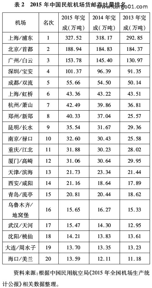 近年來,民航局和各級政府進(jìn)一步加快航空物流基礎(chǔ)設(shè)施建設(shè),中國機(jī)場數(shù)量不斷增加,機(jī)場規(guī)模不斷擴(kuò)張。2010年,機(jī)場系統(tǒng)完成固定資產(chǎn)投資總額441.5億元。2013年,機(jī)場系統(tǒng)完成的固定資產(chǎn)投資總額達(dá)到507.5億元。截止到2015年,我國大陸共有民用航空機(jī)場210個,其中定期航班通航機(jī)場206個,定期航班通航城市204個[4]。機(jī)場貨郵吞吐量逐步集中于少數(shù)機(jī)場,上海、北京和廣州三大城市機(jī)場的樞紐作用已日益顯現(xiàn)。2015年,共51個機(jī)場的年貨郵吞吐量達(dá)萬噸以上,其貨郵吞吐量與全國機(jī)場貨郵吞吐量相比,占比達(dá)到98.4%,北京、上海和廣州機(jī)場的貨郵吞吐量占比達(dá)到50.9%。其中,上海浦東國際機(jī)場的貨運吞吐量位居全球第三位。2015年中國民航機(jī)場貨郵吞吐量排名見表2。
